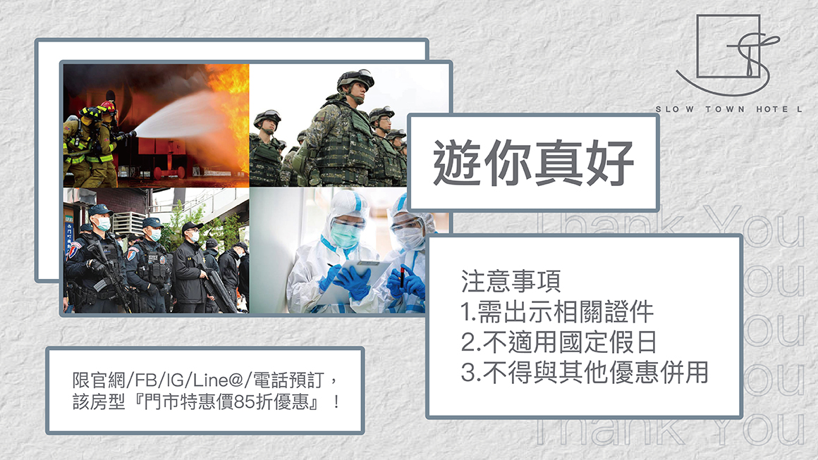 |專案內容| • 平日入住每晚享八五折優惠 • 專案房型:所有房型適用 • 適用對象:警察、消防員、軍人、醫療人員 • 本專案需使出示相關證件以示身份 |注意事項| • 此優惠不得與其他專案合併使用 • 軍校生、警校生適用本專案 • 預訂方式僅適用官網、電話、Line@、FB、IG訂房 • 僅限平日使用,假日及連續假期不適用 • 現場保留最終修改、解釋及取消本活動之權利 有任何問題歡迎來電詢問 漫映旅舍 Line@id:@fdl8146k 訂房專線:02-2522-2111 立即預訂
